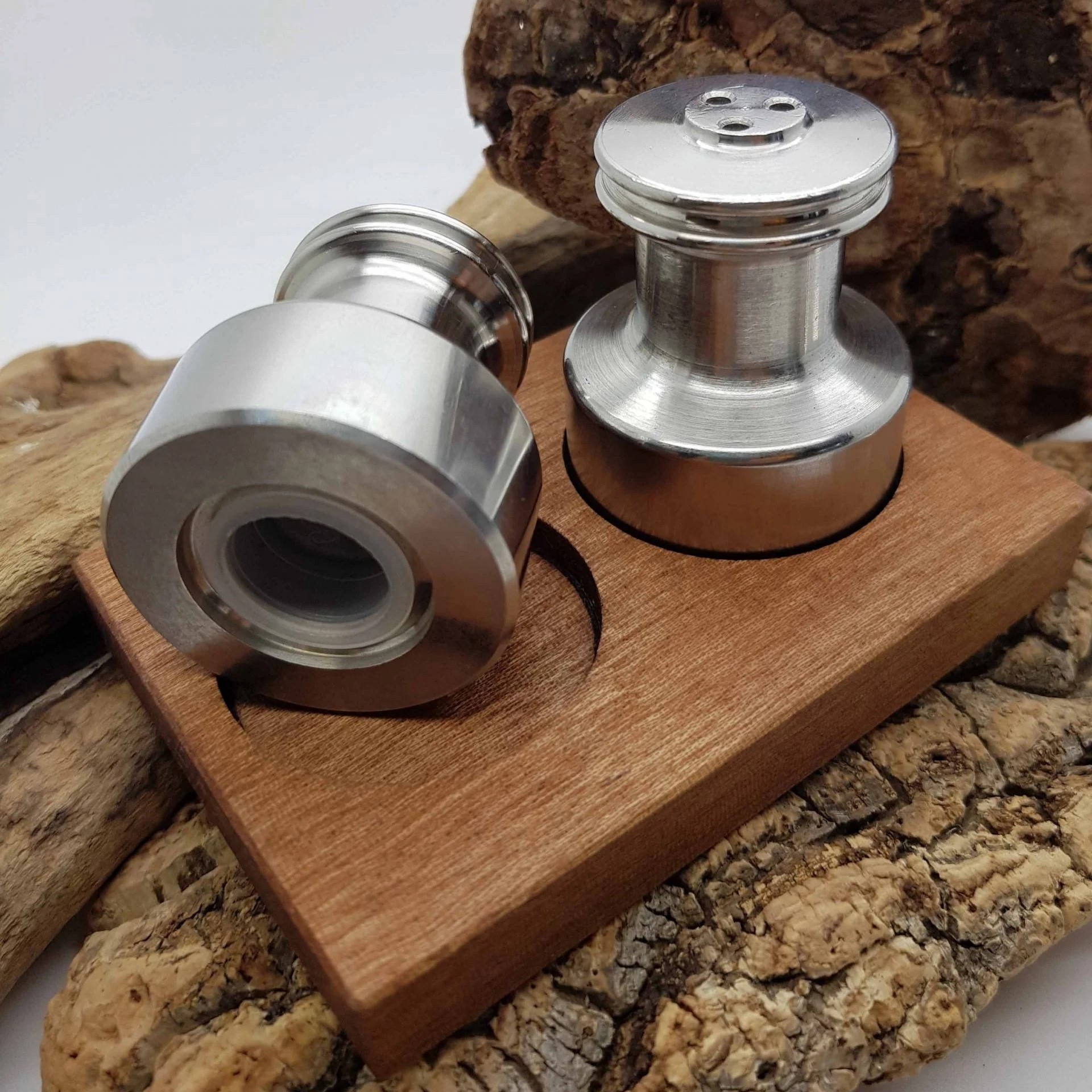 Verkrijgbaar apart of als set op mahonie houten plankje