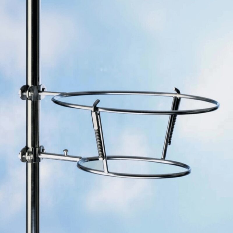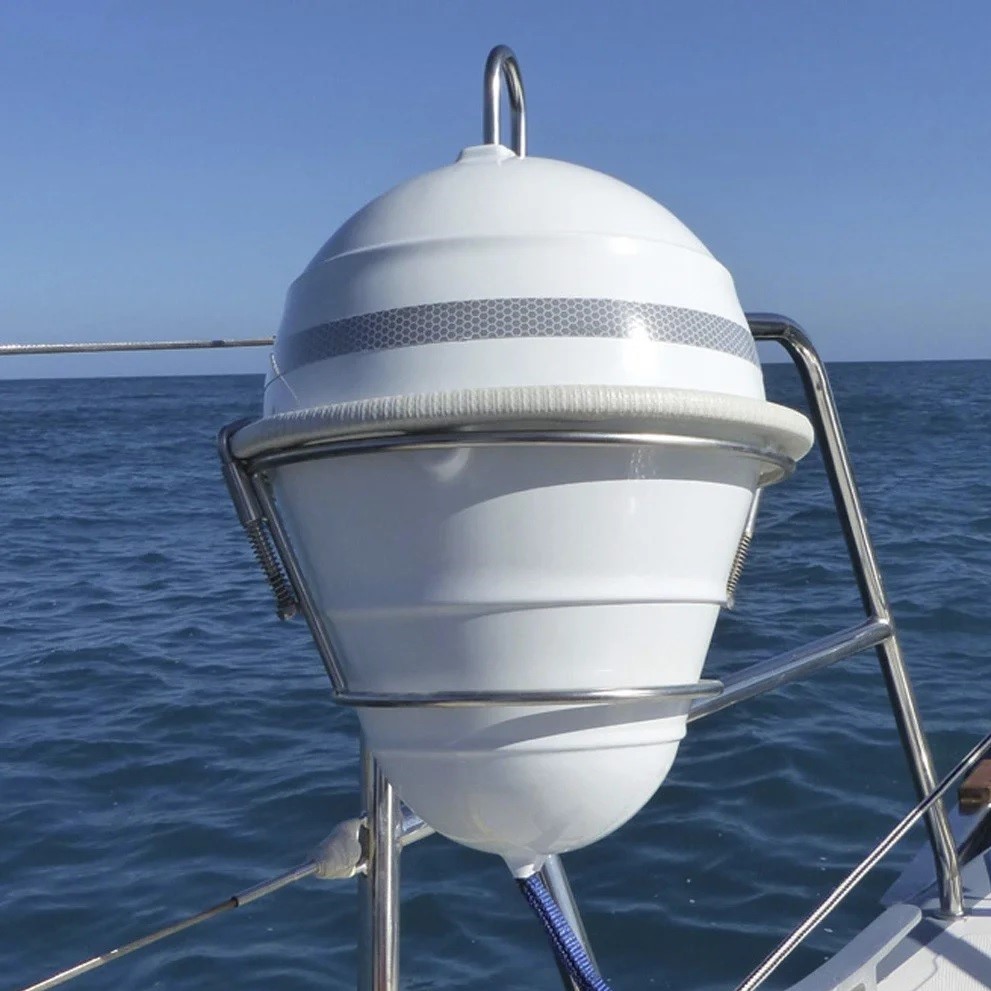 RVS ophangbeugel voor het veilig ophangen van een Swi-TEC ankerboei. Verstelbaar voor diverse relingen en voorzien van beveiliging tegen verlies.